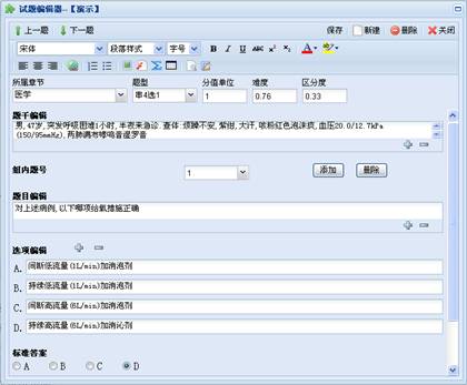 题干编辑:是指一组成组题前面共有的内容,如英语完形填空题或阅读题前的短文。如果在指标管理中对题型定义时没有设定组题题干则没有本编辑区,试题、答案编辑区相应上移扩大。编辑方法同下面试题部分。